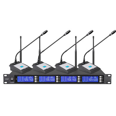 该系列产品为红外式自动对频,二,四,信道可调频多通道无线会议麦克风,产品采用杂音干扰较少的UHF频段PLL相位锁定技术,完美的抗杂讯干扰特性,任何类似系统都无法比拟。 全金属材质标准机箱,1U金属面板分别配置二信道接收机,装配LCD显示屏幕,分别显示,工作通道,工作频率,6级音频电平显示。充分,快捷地了解接收机的全部动作讯息。采用电子式按键控制面板操作。 主机分别提供衡音频输出,与混合非平衡输出,全面适应各种连接需求。会议座采用独立外观设计,高保真金属拾音头幕显示。
